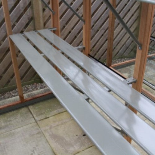 The aluminum staging shelf adds vital extra storage space in the greenhouse and helps you to create a most efficient set-up. It's height adjustable and wheelchair friendly. The 'no-legs' Cantilever set up means you can use the floor under the staging effectively for heavy pots or bags of compost without cluttering your main path.