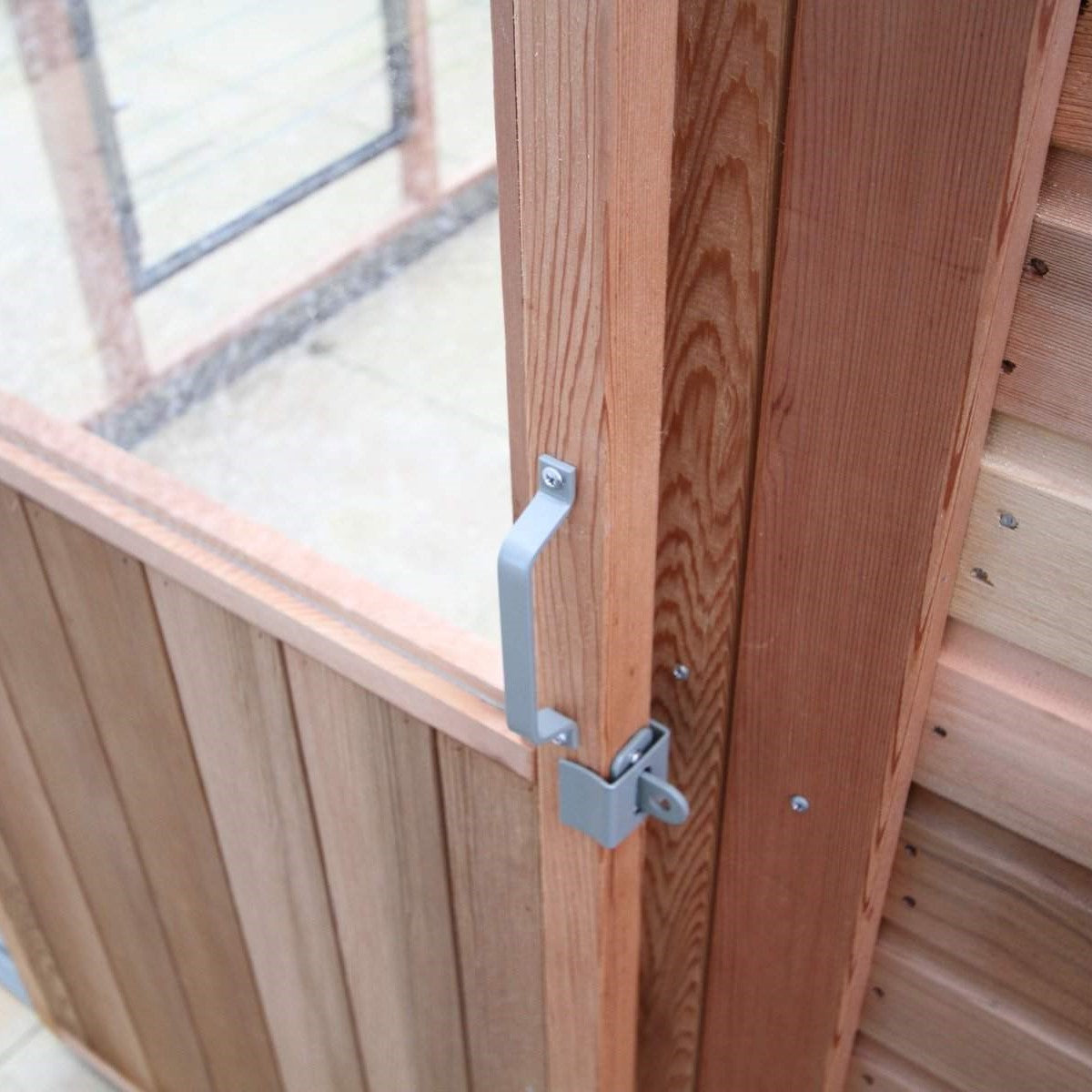 Victorian Alton greenhouses feature a hinged door with a low threshold as standard, ensuring easy access. The hinges are crafted from high-quality stainless steel for durability and longevity, and the door handle includes a secure mortice lock, providing both functionality and enhanced security for your greenhouse.