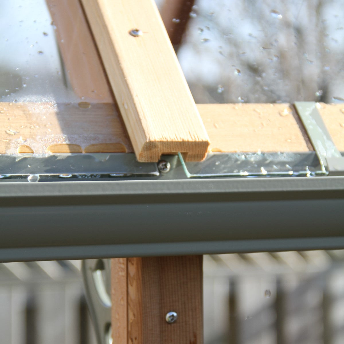 The aluminum base is designed to keep wood away from areas where water tends to collect. This innovative feature allows the glass to sit directly on the metal base, preventing side water from running onto the wood—a common cause of rot in other greenhouses—ensuring greater durability and longevity.