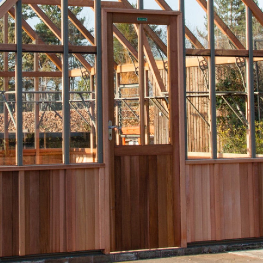 Victorian Alton greenhouses feature a hinged door with a low threshold as standard, ensuring easy access. The hinges are crafted from high-quality stainless steel for durability and longevity, and the door handle includes a secure mortice lock, providing both functionality and enhanced security for your greenhouse.