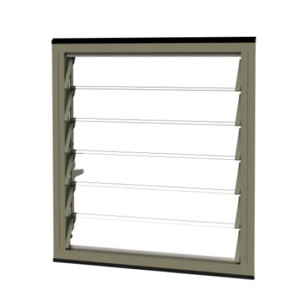 The standard Alton Louver Window includes a manual handle for easy operation, while an optional automatic louver opener is available for hands-free temperature-sensitive vent adjustment.