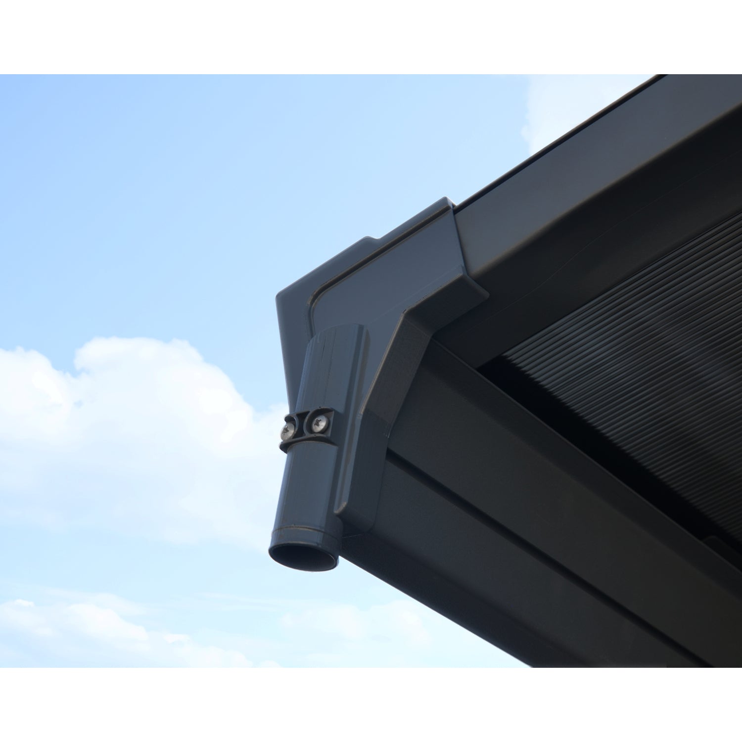 Tested to withstand winds up to 56 mph and 20 lbs./ft² of snow. - Built-In Gutters: Includes integrated rain gutters and gutter outlets to direct rainwater.