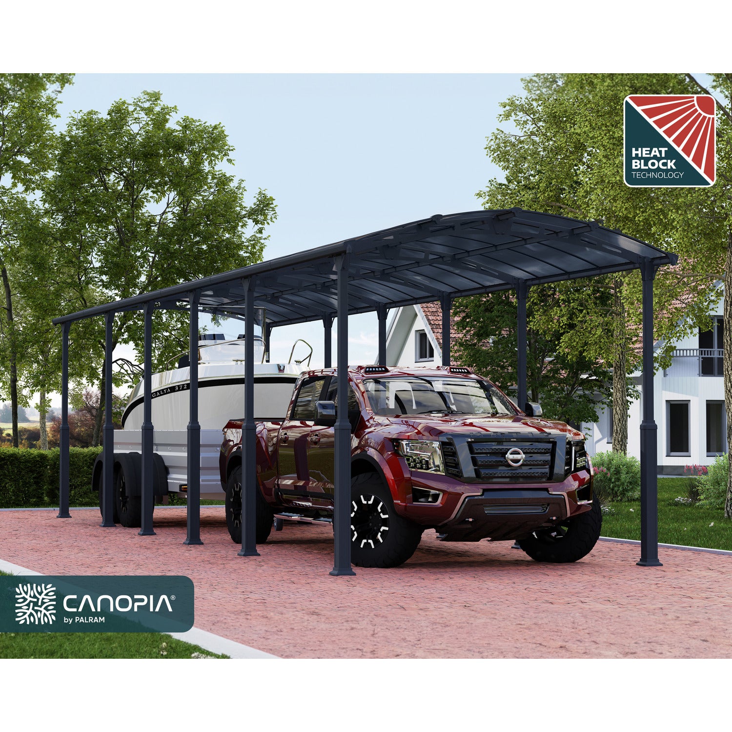 The Arcadia Alpine 12' x 42' Carport is a stylish and durable shelter that will protect your vehicle, RV, trailer, or oversized vehicle from snow, rain, leaves and harmful UV rays. The Alpine offers 10 ft. of clearance, which is 3.5 ft. more than the standard Arcadia, making it ideal for taller vehicles and trailers. The virtually unbreakable 6mm polycarbonate roof panels provide 100% UV protection and are gray tinted for additional shade protection. The carport comes with pre-drilled holes, pre-cut panels and required hardware as well as an anchor kit for securing your carport. Polycarbonate roof panels have been designed to simply slide into place eliminating the need to get on the roof to secure them. The sturdy, powder coated gray aluminum and galvanized steel frame is rust resistant, easy to clean with your garden hose, and has a minimum 16lbs/sq. ft. snow load capacity. Additional features include; integrated gutters with downspouts to direct rain away from the sides, wide entry with high clearance and a great re-assembly option in case you need to change locations. It is designed to be installed easily by two people and does not require advanced building skills or special tools.